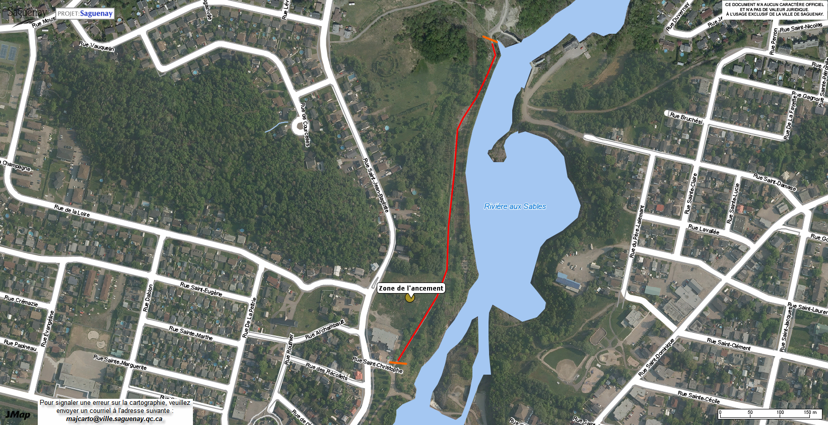 En raison des feux d'artifices prévus par le festival Saguenay en neige, une partie de la piste cyclable près de la rue Saint-Jean-Baptiste sera fermée entre 10 h et 22 h le samedi 7 février. Voir le plan ci-bas pour le secteur concerné.