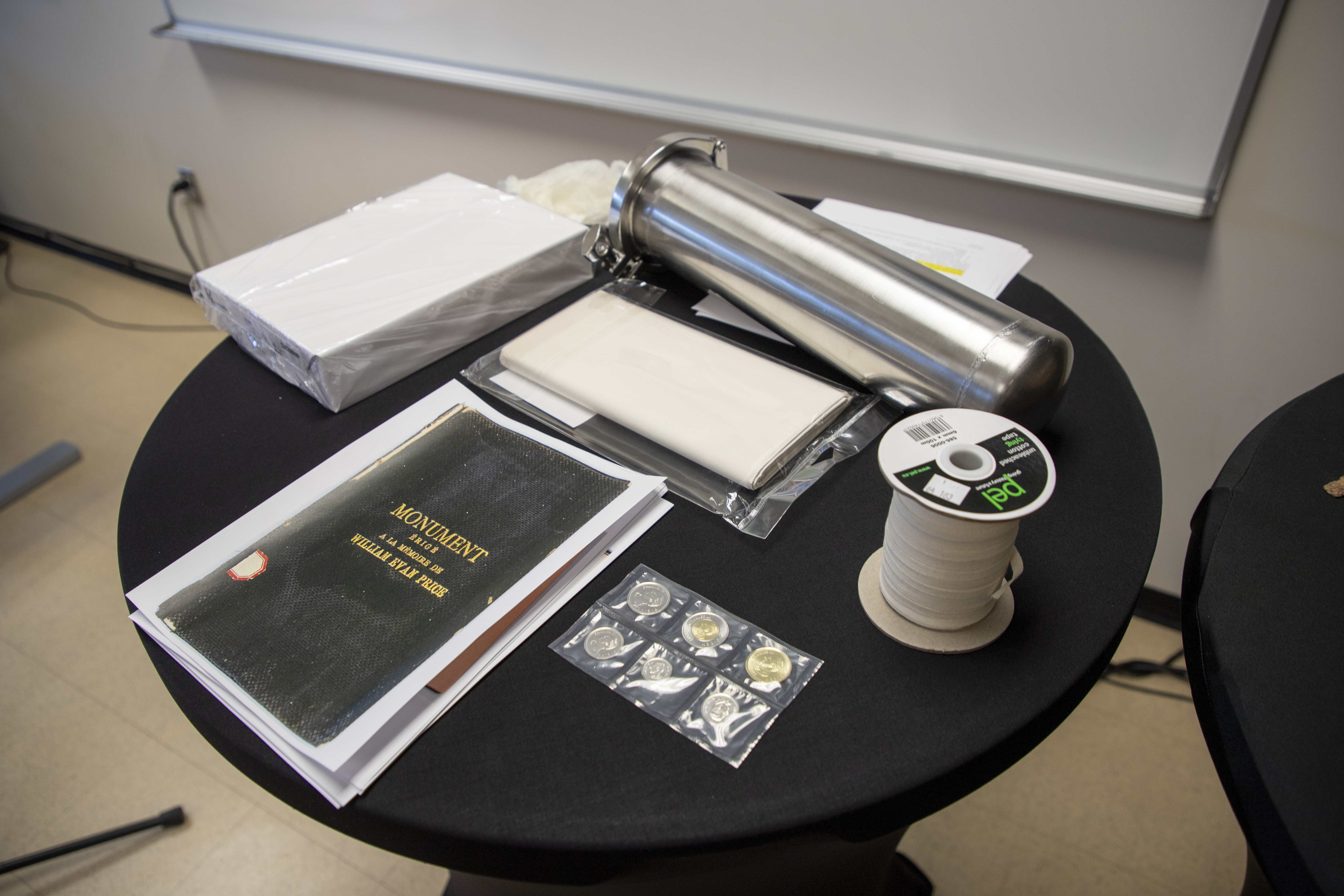L’une des capsules temporelles, composée d’un coffret de plomb et surtout des artefacts et documents d’époque qu’il renfermait, avait été déposée dans une niche aménagée dans l’un des blocs de pierre du monument. Celle-ci est en cours d’analyse au Laboratoire d'histoire et d'archéologie du Subarctique oriental de l'UQAC.